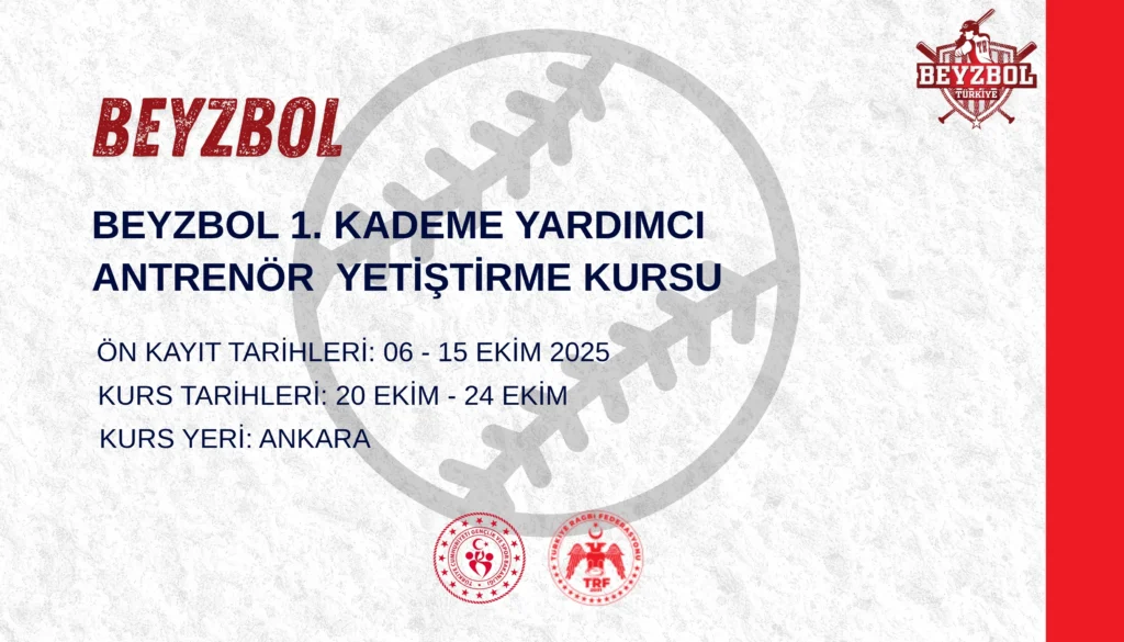 Beyzbol 1. Kademe Yardımcı Antrenör Yetiştirme Kursu açılacaktır. Kurs 20.10.2025- 24.10.2025 tarihleri arasında Ankara’da gerçekleştirilecektir.