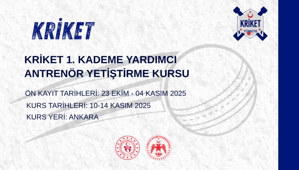 Kriket 1. Kademe Yardımcı Antrenör Yetiştirme Kursu açılacaktır. Kurs 10.11.2025- 14.11.2025 tarihleri arasında Ankara’da gerçekleştirilecektir.