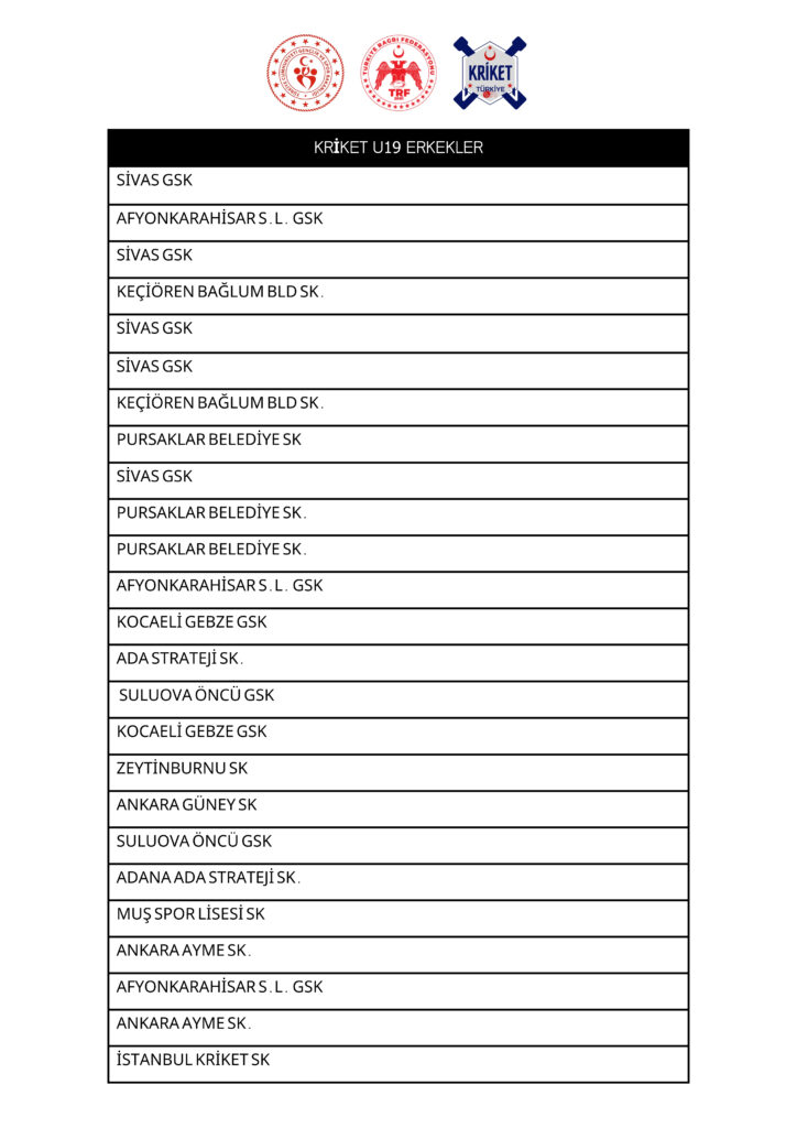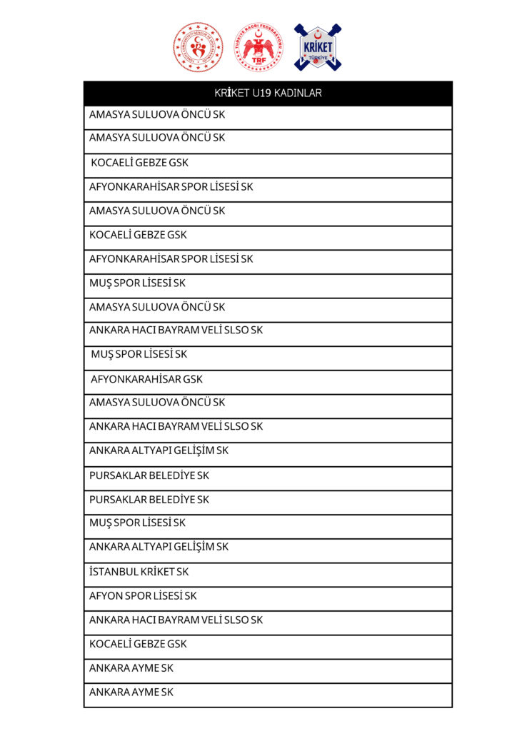 2025 Yılı U19 Kriket Kadınlar ve Erkekler Türkiye Şampiyonası sonunda, 2025 yılı U19 Kriket Milli Takım sporcu havuzu belirlenmiştir.