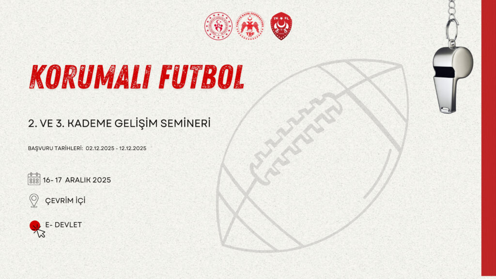 Korumalı Futbol 2. ve 3. Kademe gelişim semineri gerçekleşecektir. Seminer 16.12.2025- 17.12.2025 tarihleri arasında çevrim içi gerçekleştirilecektir.