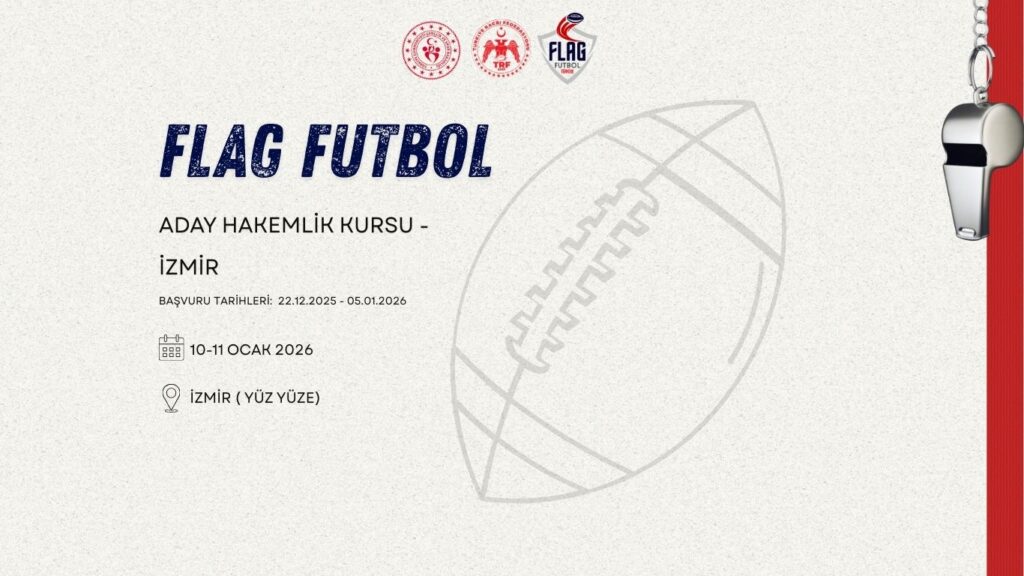 Türkiye Ragbi Federasyonu tarafından düzenlenecek Flag Futbol Aday Hakemlik Kursu, 10–11 Ocak 2026 tarihlerinde İzmir’de yüz yüze olarak gerçekleştirilecektir.