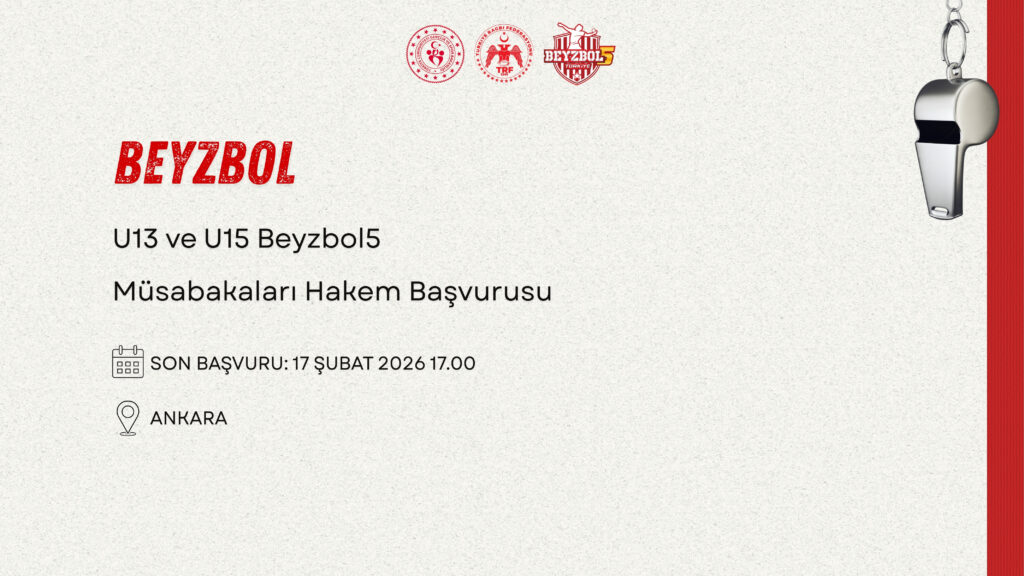 U13 ve U15 Beyzbol5 Müsabakaları 20-23 şubat 2026 tarihleri arasında Ankara ilinde yapılacaktır . Görev almak isteyen hakemlerin 17 şubat 2026 tarihi saat 17.00 ‘a kadar formu doldurmaları gerekmektedir.